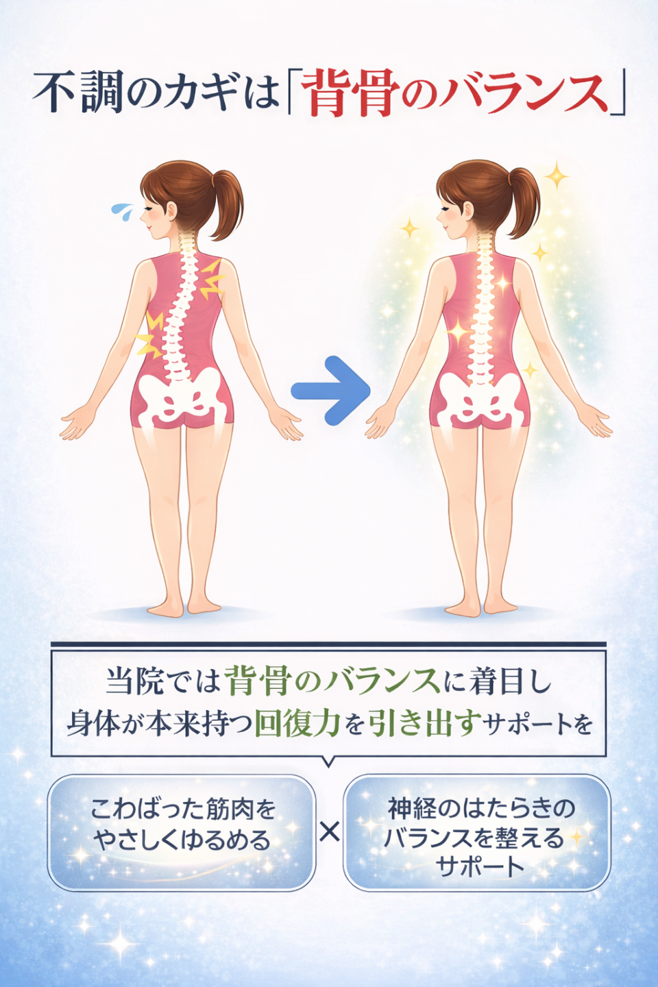 背骨と神経を整えることで、身体は少しずつ回復しやすい状態に変わっていきます。