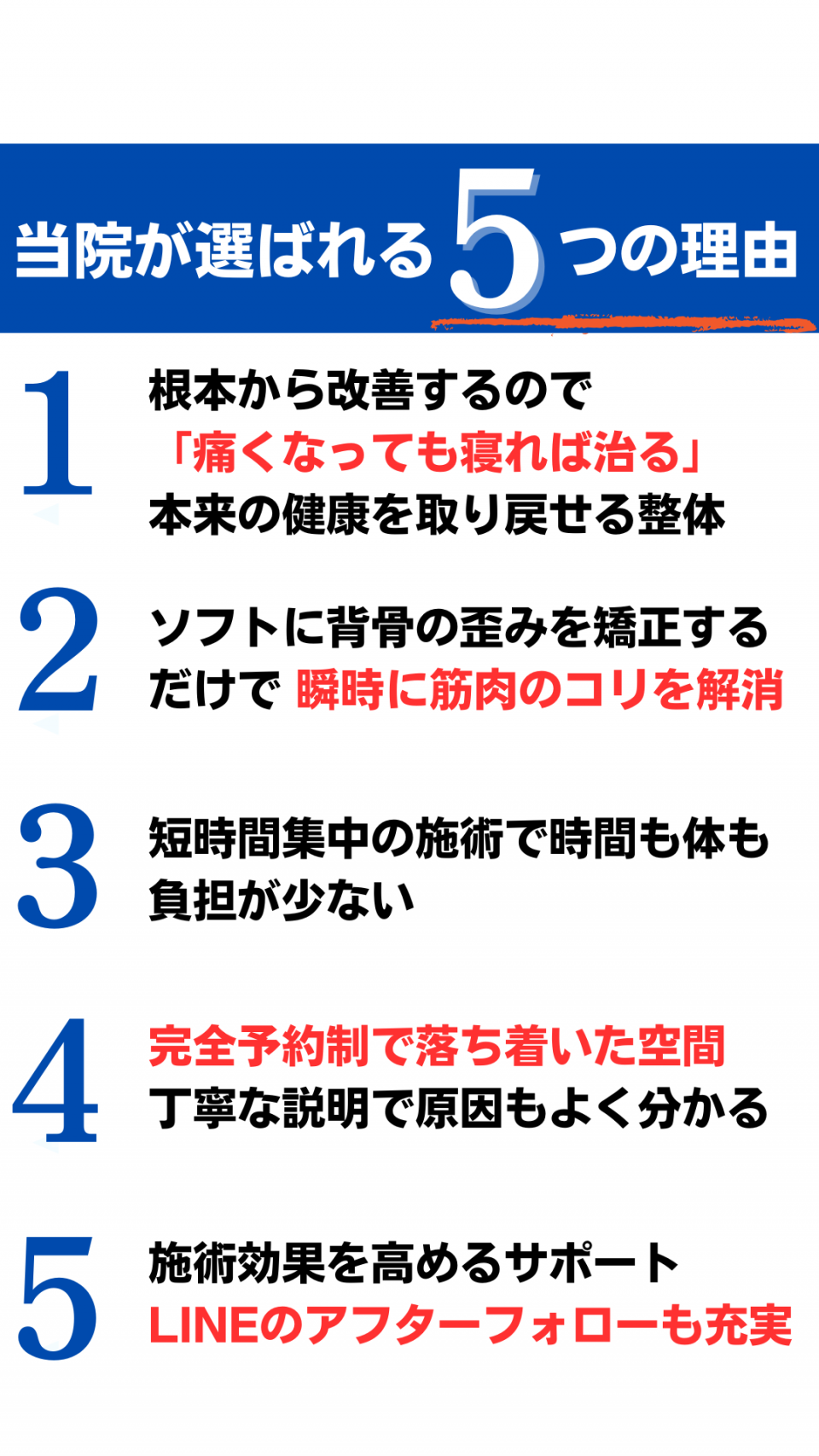 3回目ですが、気にならないくらい軽減されました。説明も丁寧で分かりやすく、朝早くから営業しているのも良いです。朝整体を受けると、1日がスッキリ過ごせます。